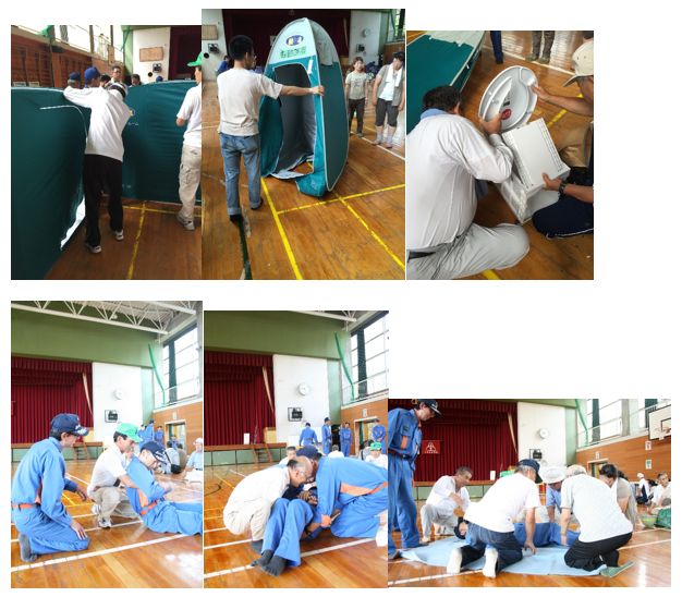 負傷者の搬送方法や避難所用パーテーション、災害用簡易トイレの設営方法などを消防署員、